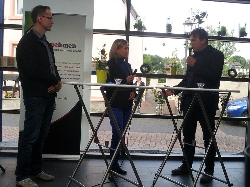 Bei einer Podiumsdiskussion erklärten die Unternehmer Alfons Jochem (Vorstand Volksbank Hochwald-Saarburg eG) und Gina Inman (worldwide languages) sowie die Vertreter gemeinnütziger Organisationen Hans Tilly (Geschäftsführer Sozialpädiatrisches Zentrum Trier) und Hélène de Wolf ( Vorstandsmitglied Lokales Bündnis für Familie e.V. und Unternehmen à la carte) im Gespräch mit Susanne Rendenbach ihre persönliche Sicht und warum sie sich als BUnternehmer verstehen und engagieren.